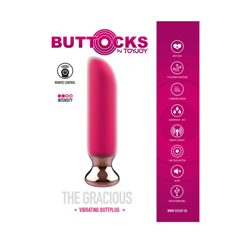 Il Gracious è un plug anale rosa gelido e vibrante e dispone di un potente motore con 7 diverse modalità di vibrazione e 3 velocità di vibrazione. Ogni modalità offre profonde vibrazioni rombanti, che possono essere facilmente controllate sull'oggetto o con il telecomando incluso. Buttocks di TOYJOY è una linea premium di butt plug ad alte prestazioni, creata con una varietà di caratteristiche speciali per aumentare il tuo piacere anale. Buttocks di TOYJOY è la scelta perfetta per una stimolazione anale di livello superiore.